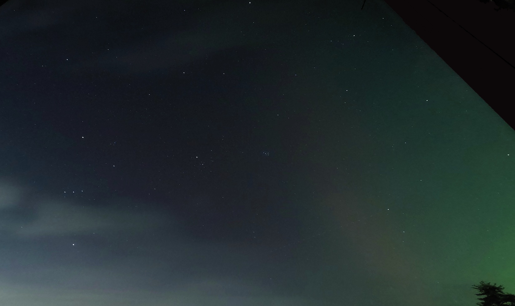 An intense geomagnetic storm following a large coronal mass ejection (CME) from the Sun caused colourful auroral displays across Europe and in the United States. Here the Aurora was visible briefly through a gap in the cloud cover. In this image, Orion, Taurus and the Pleiades on the left are joined by the green and red colours of the Aurora on the right.