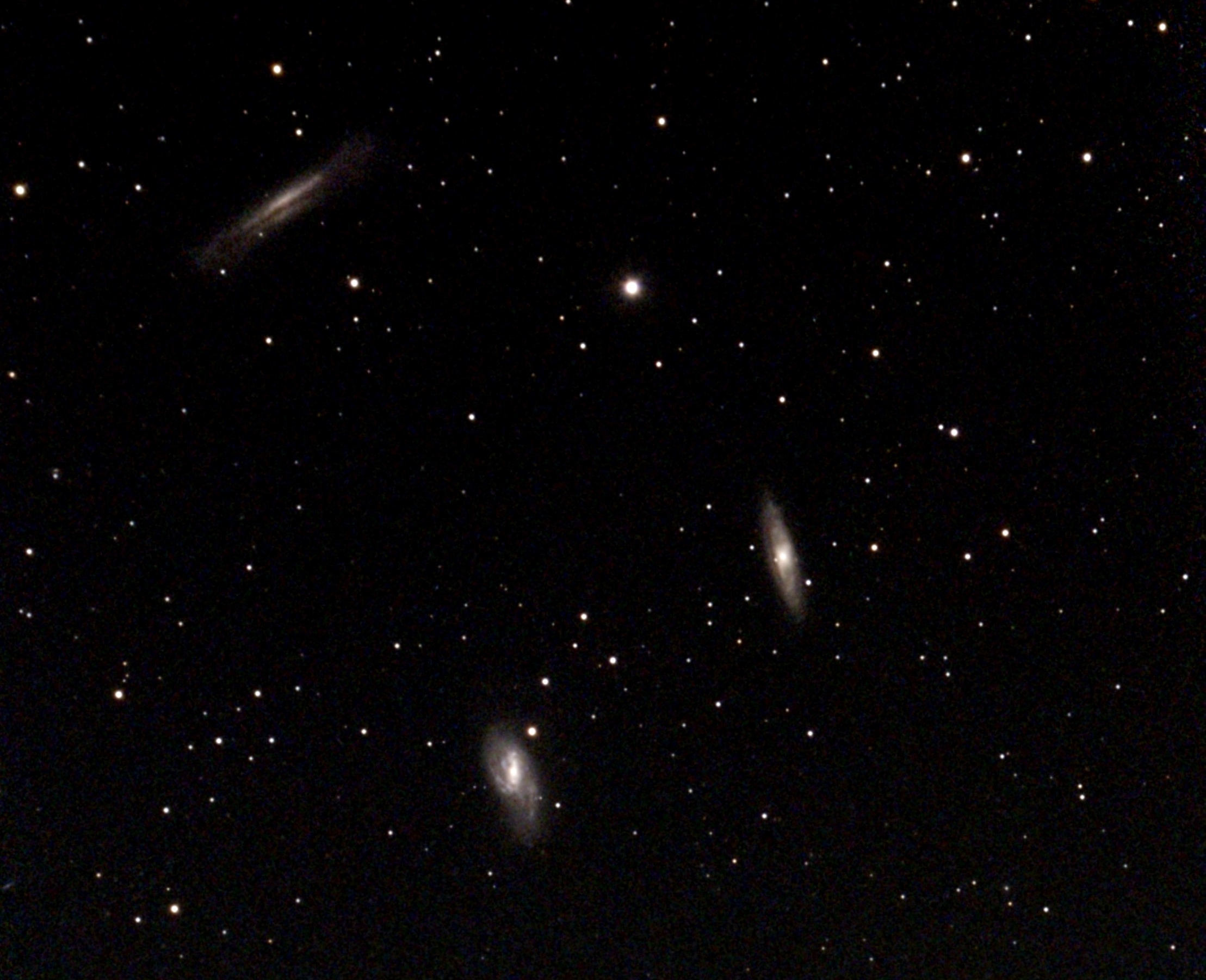 The Leo Triplet of Galaxies. M65 (right) and M66 (bottom) are two spiral galaxies. The third member of the trio, NGC 3628 (top left), is also a spiral galaxy, this time seen edge on. The prominent dust lanes give NGC 3628 its alternative name of the Hamburger Galaxy. All three are between 30 and 35 million light years from Earth. Imaged using a Seestar S30.