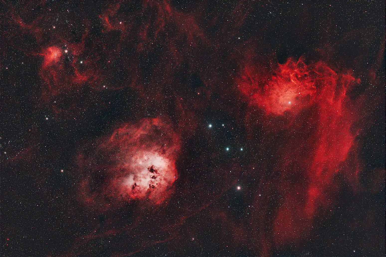 The Flaming Star (IC405) and the Tadpole (IC410) - two of the most distinctive objects in Auriga. The Flaming Star (right) is an emission and reflection nebula, energised and illuminated by the variable star AE Aurigae, and the Tadpole (left) is a star forming region. The tadpoles are streams of gas surrounding newly-forming star systems. Imaged using an SQA 70 mm telescope with narrowband filters.