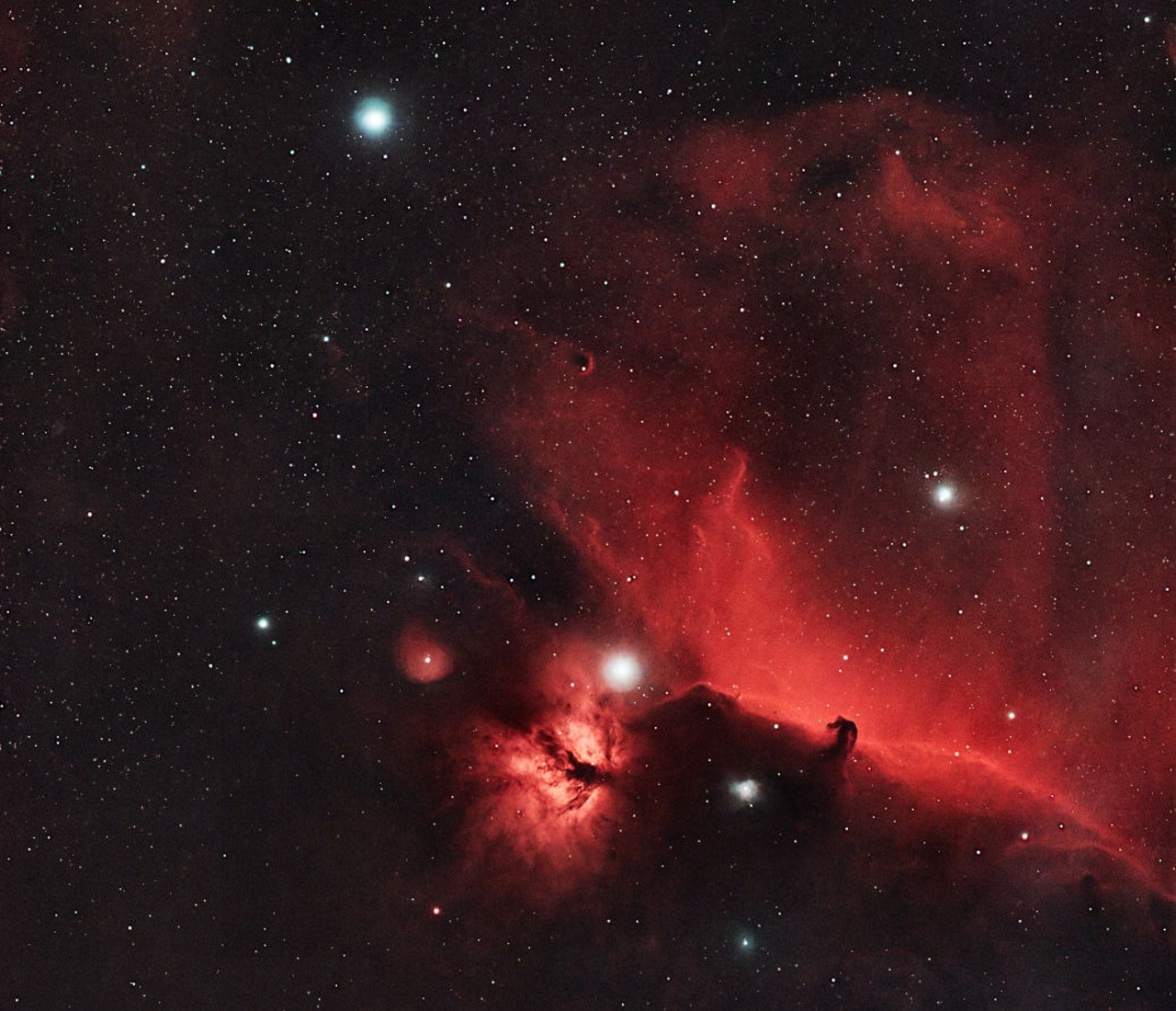 Within these bright red clouds of glowing hydrogen gas, an obscuring cloud of darker material forms the shape of the horse's head, with the flame to the left. The bright star above the horse's head is sigma orionis, and the other two bright stars are the leftmost two stars in Orion's Belt: Alnitak (just above the flame) and Alnilam (top left). Imaged using an SQA 70 mm telescope with narrowband filters.
