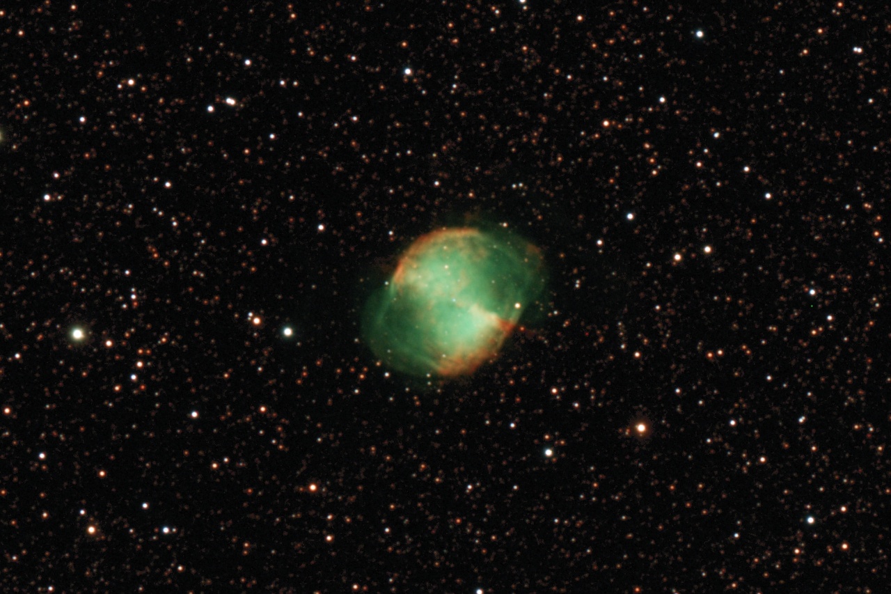 Approximately 1200 light years away, M27 in the faint constellation Vulpecula is an excellent example of a planetary nebula. The dumbbell shape is formed by glowing shells of gas thrown off from the dying star in the centre. M27 is easy to find in the summer and autumn sky, located between Cygnus and Sagitta within the Summer Triangle. Imaged using triband filters.